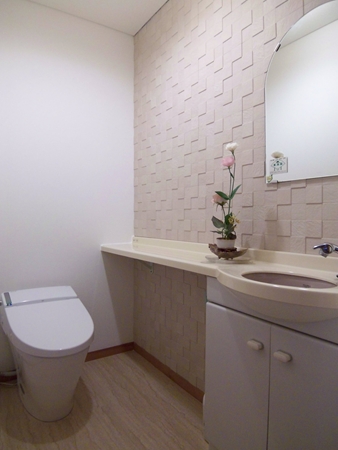 手洗い器とカウンターはもったいないのでそのままとし、壁面一部をエコカラットにて仕上げました。